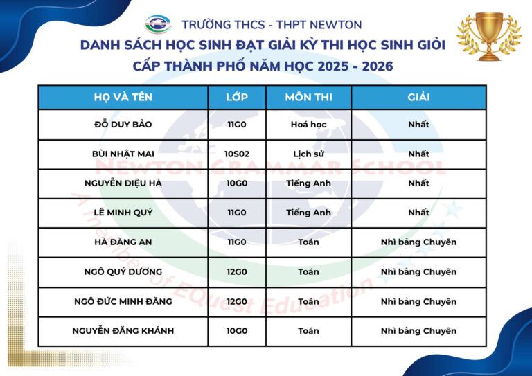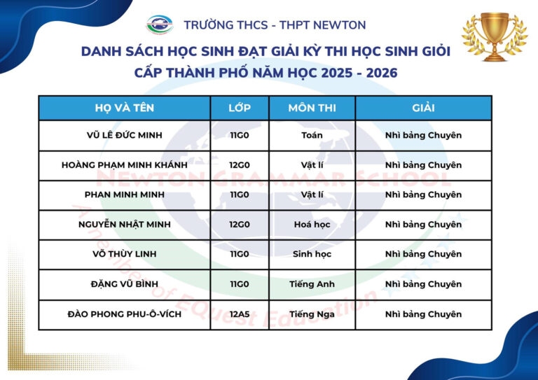 Tại kỳ thi học sinh giỏi THPT TP Hà Nội năm học 2025 – 2026 do Sở GD&ĐT Hà Nội tổ chức cuối tháng 9/2025, thầy và trò trường THCS – THPT Newton đón nhận kết quả tích cực: đứng top 5 trên tổng số 237 trường THPT có kết quả thi học sinh giỏi cao nhất thành phố. Không chỉ có số lượng học sinh dự thi đông đảo, Newton còn ghi dấu ấn ở chất lượng giải đạt được với tổng số 43 giải, trong đó có: 4 giải Nhất, 20 giải Nhì, 9 giải Ba và 10 giải Khuyến khích, trải đều ở tất cả các bộ môn: toán, lý, hoá, sinh, tiếng Anh, tiếng Nga, văn, sử, địa…