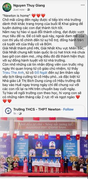 Mỗi thành tích học sinh đạt được không chỉ là niềm vui của gia đình và nhà trường, mà còn là minh chứng cho mối gắn kết bền chặt giữa phụ huynh – thầy cô – học sinh. Những chia sẻ chân thành, sự sát cánh và ủng hộ hết lòng từ quý phụ huynh chính là động lực để Newton ngày càng hoàn thiện, trở thành “ngôi nhà thứ hai” của các con.