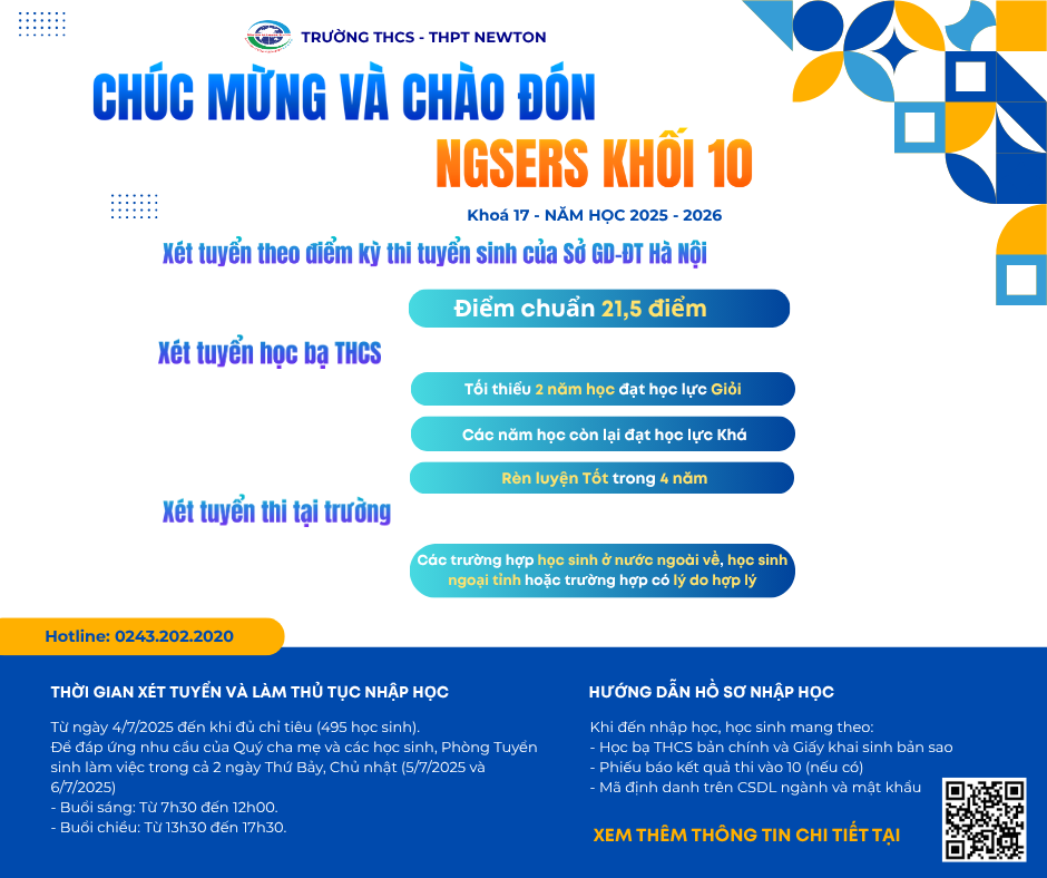 Trường THCS – THPT Newton trân trọng thông báo tới Quý cha mẹ và các em học sinh về điểm chuẩn, phương thức tuyển sinh và chương trình học bổng vào lớp 10 năm học 2025 – 2026 như sau:
