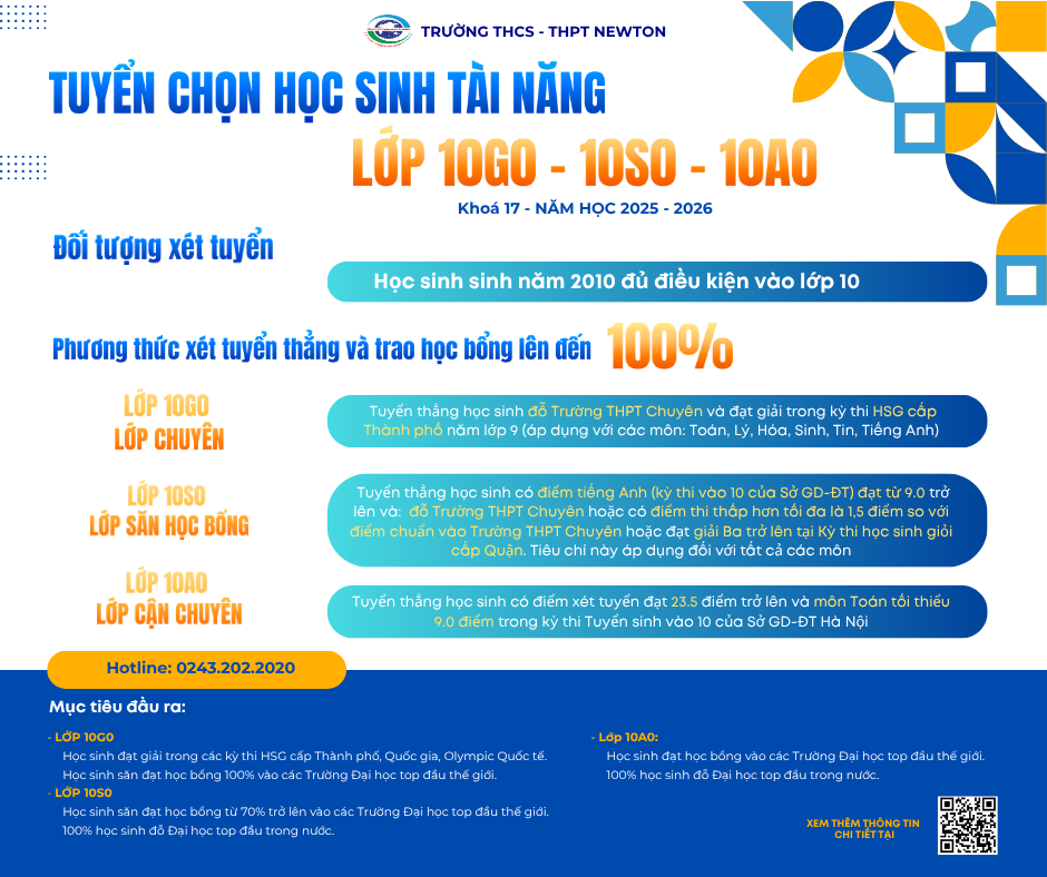 Với sứ mệnh phát hiện và bồi dưỡng học sinh xuất sắc, Trường THCS – THPT Newton tiếp tục triển khai chương trình tuyển chọn đầu vào cho các lớp chất lượng cao: 10G0 – 10S0 – 10A0, với lộ trình học tập rõ ràng, mục tiêu vươn tới các trường đại học hàng đầu trong nước và quốc tế.