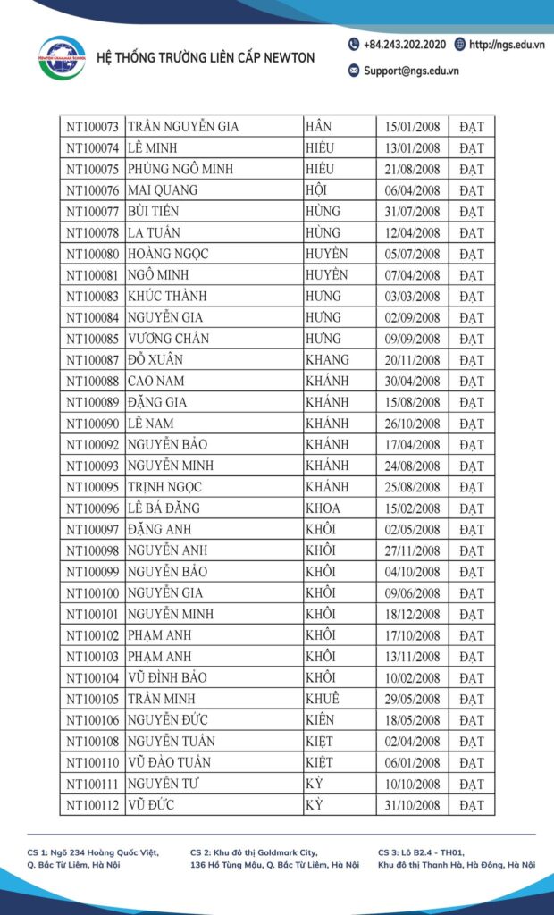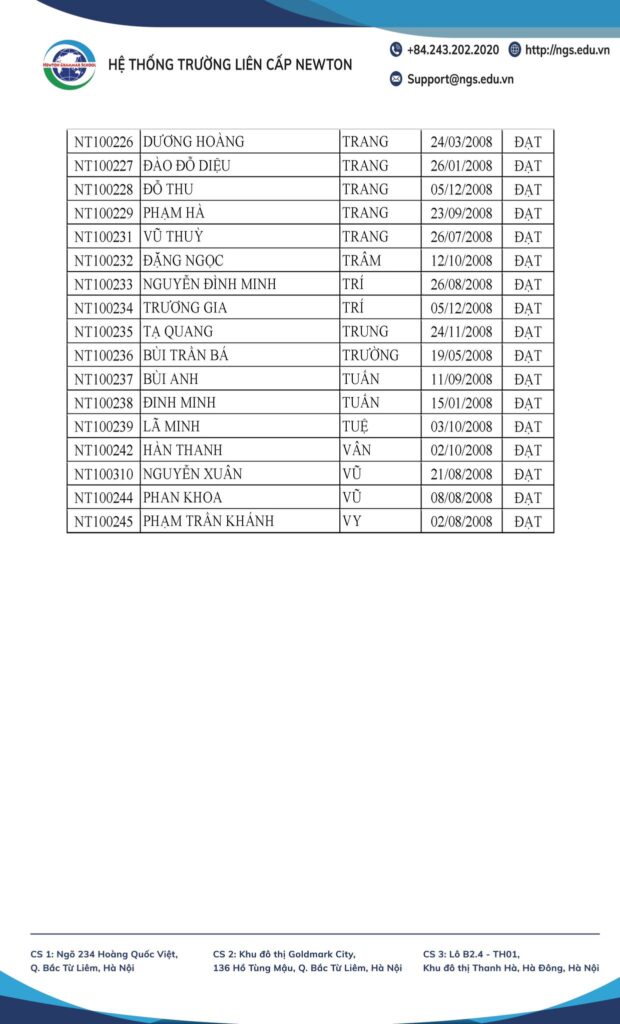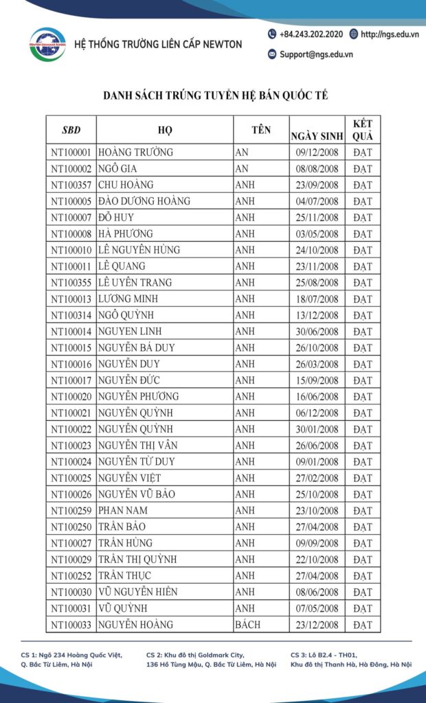 Học sinh không có tên (tức chưa đạt), Quý Phụ huynh có thể đăng kí cho con tham gia đợt đánh giá năng lực tiếp theo tại Phòng Tuyển sinh của nhà trường hoặc đăng kí online tại website: ngs.edu.vn.